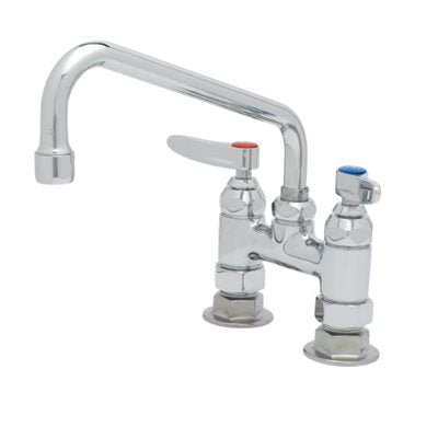 4" deck mount mixing faucet with polished chrome plated brass body, 8" swing nozzle with stream regulator outlet, compression cartridges with spring checks, lever handles, and 1/2" NPT female inlets. 17.90 GPM @ 60 psi