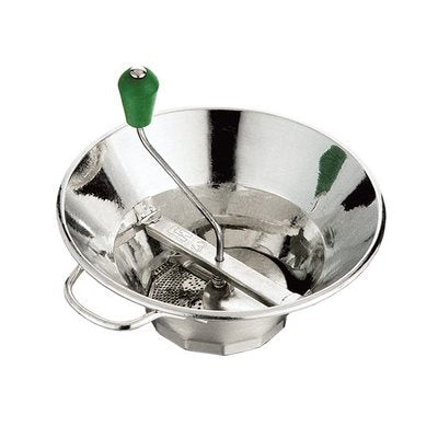 Food mill (5 qt.) Includes 3 grids (1.5, 2.5 & 4 mm). Robust appliance with fast rate for preparing purees, stewed fruit, fish soup. 9.75" high. 5 qt capacity. 12" top diameter.