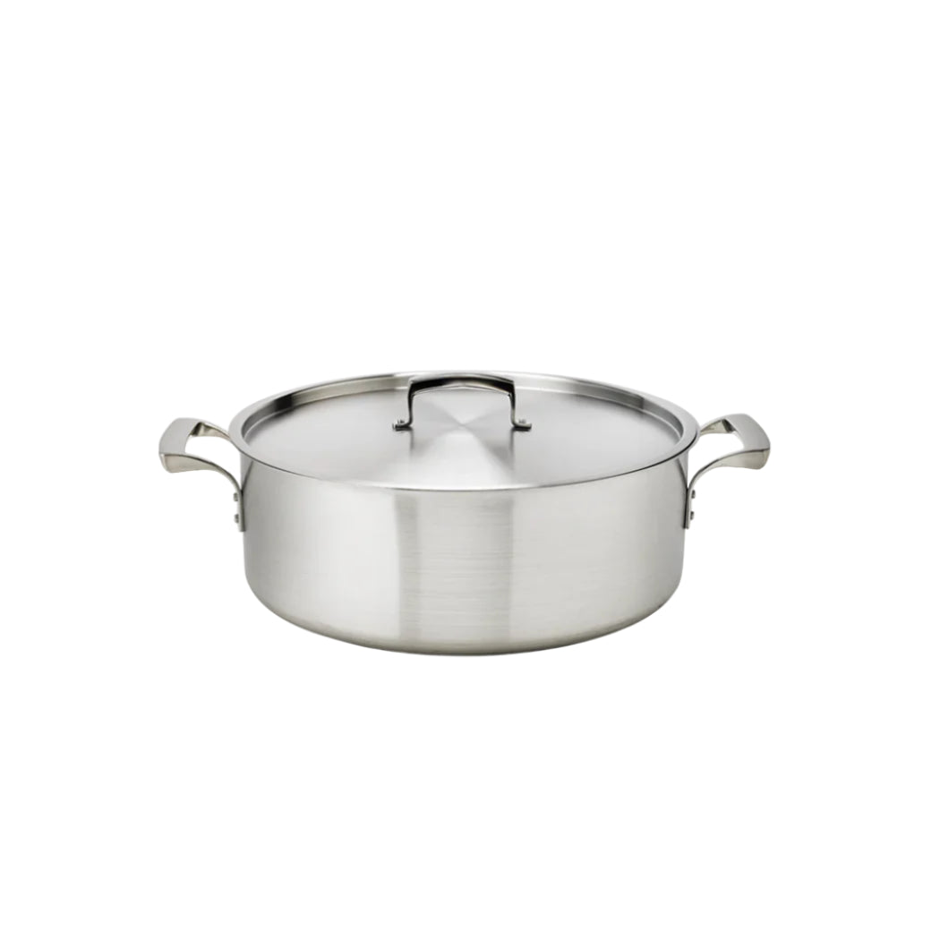 The Thermalloy 8 Qt Braiser Stainless Steel is designed for slow cooking, browning, and braising large portions of meat and vegetables. Its tri-ply construction ensures superior heat distribution, making it an essential piece for both home and commercial kitchens.