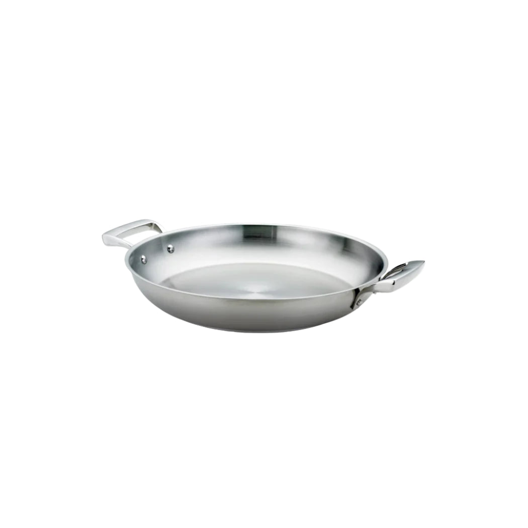 The Thermalloy 9.5" Stainless Steel Paella Pan is designed for superior cooking performance. Ideal for preparing paella, stir-fries, and other dishes that require even heat distribution, it ensures efficient cooking with its tri-ply construction.