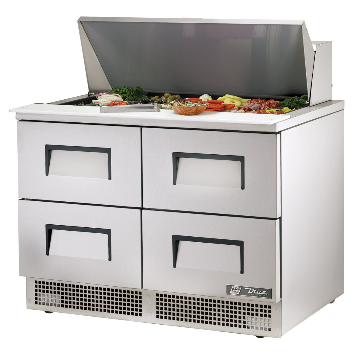 True's TFP-48-18M-D-4 Sandwich / Salad 18 Pan Refrigerated Prep Table Megatop with 4 Drawers uses the highest quality materials and oversized refrigeration systems providing the user with colder product temperatures, lower utility costs, exceptional food safety and the best value in today's food service marketplace.