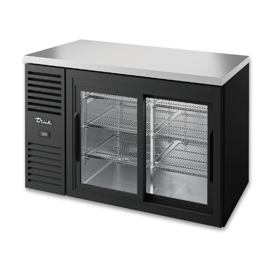 True 52" Back Bar Refrigerator with 2 Glass Sliding Doors, Black Powder Coated