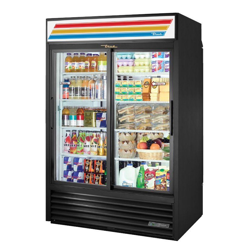 True's GDM-47RL BLK Merchandising Rear Loading Refrigerator with 2 Glass Sliding Doors, Black Exterior uses the highest quality materials and oversized refrigeration systems provide the user with colder product temperatures and lower utility costs in an attractive merchandiser that brilliantly displays packaged food and beverages.