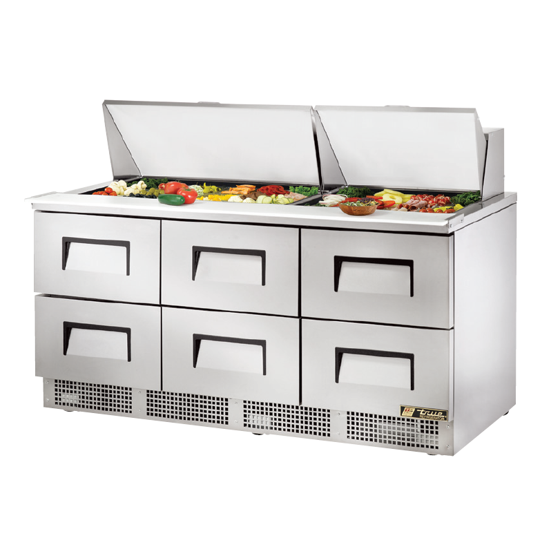 True’s TFP-72-30M-D-6 Sandwich / Salad 30 Pan Refrigerated Prep Table Megatop, 6 Drawers commitment to using the highest quality materials and oversized refrigeration systems provides the user with colder product temperatures, lower utility costs, exceptional food safety and the best value in today’s food service marketplace.