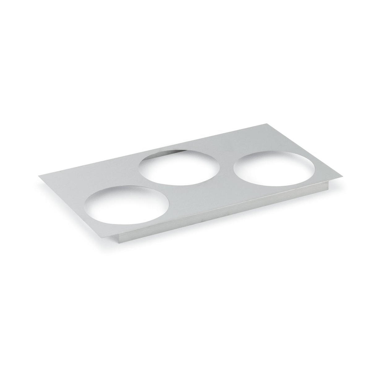 Vollrath 4/3 Size Adapter Plate is designed to customize your steam table efficiently. Crafted from durable 300-series stainless steel, this adapter plate fits standard steam table wells and features three 8⅜-inch round cutouts to hold 7¼-quart insets (item 78184). Its polished, smooth design prevents spills, enhances energy efficiency by stopping steam loss, and is easy to clean.