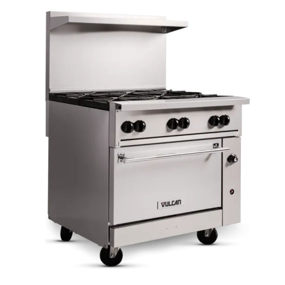Vulcan's of our most popular range models, this 36” range can keep up with your kitchen even at its busiest. Six 30,000 BTU/hr. burners can handle a lot of menu items at once.