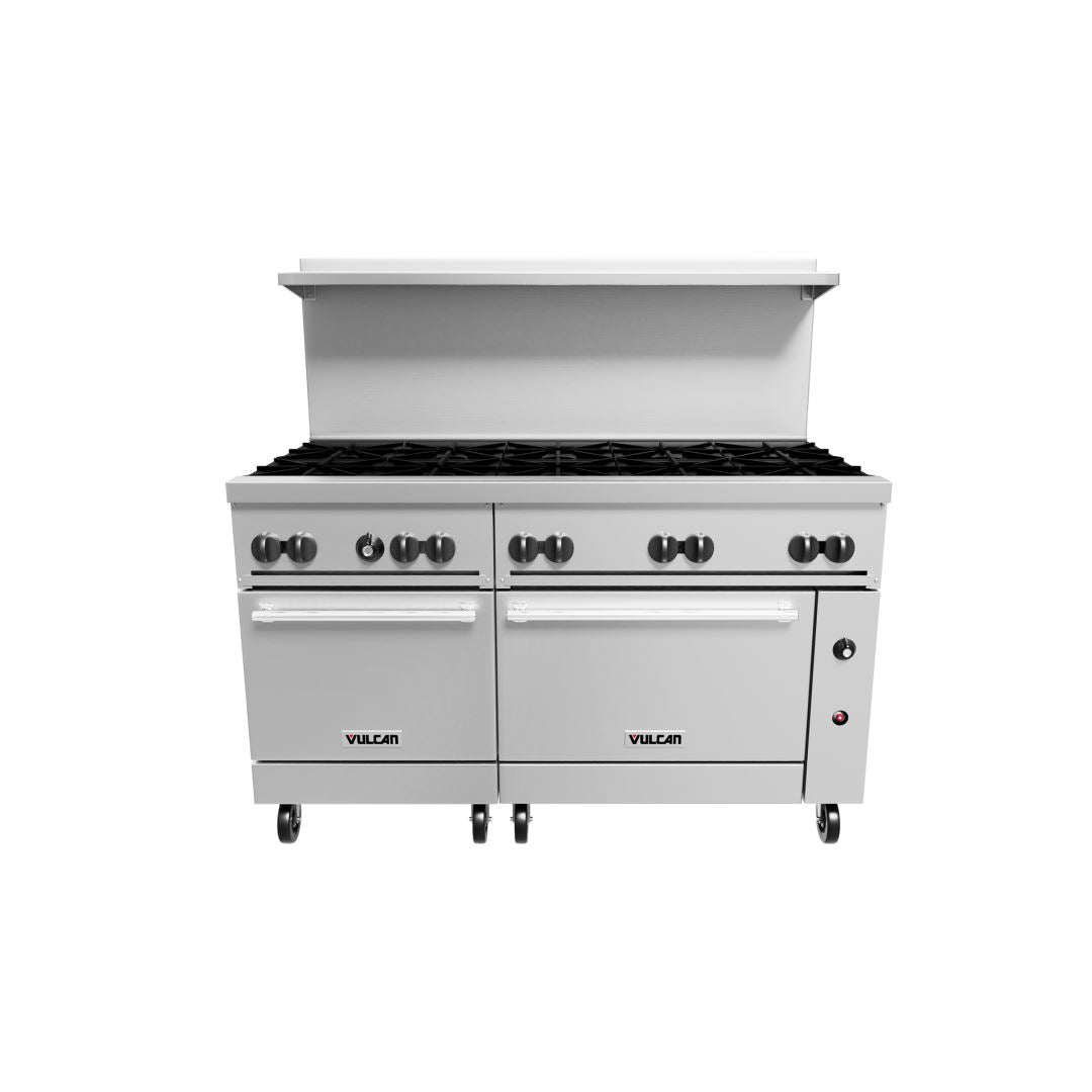 The Vulcan 60" 10 Burner Gas Range with 2 Standard Ovens is a powerhouse cooking solution for high-volume commercial kitchens. Built with a fully MIG welded steel frame, stainless steel exterior, and heavy-duty cast grates, this range delivers maximum performance, durability, and efficiency. Designed for busy restaurants, catering operations, and institutional kitchens, it offers exceptional cooking flexibility with ten powerful open burners and two spacious ovens.