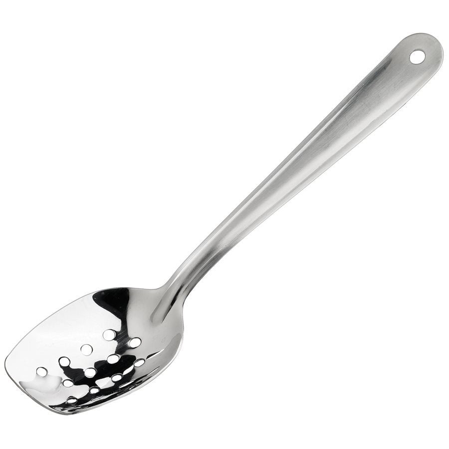 The Winco perforated plating spoon offers precision and finesse, ideal for controlled presentation of sauces, garnishes, and more.