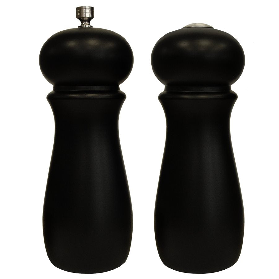 The Winco Salt & Pepper Grinder set, featuring a sleek black matte finish and durable rubberwood construction.
