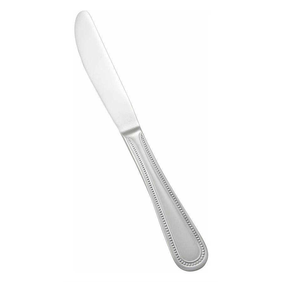 The Winco Deluxe Pearl Dinner Knife offers reliable performance and classic style, making it an excellent addition to restaurants, catering services, and cafeterias.