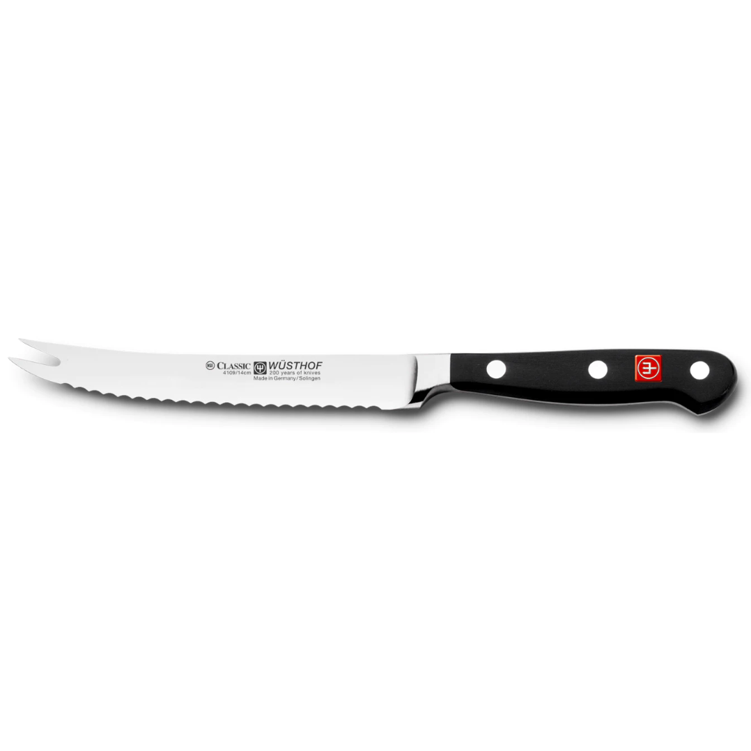 WÜSTHOF Classic Tomato Knife, a German-crafted essential for slicing delicate foods. Its 5.5-inch high-carbon stainless steel serrated blade, sharpened with PEtec technology, glides through tomatoes, cheeses, and breads without crushing, while the forked tip aids serving.