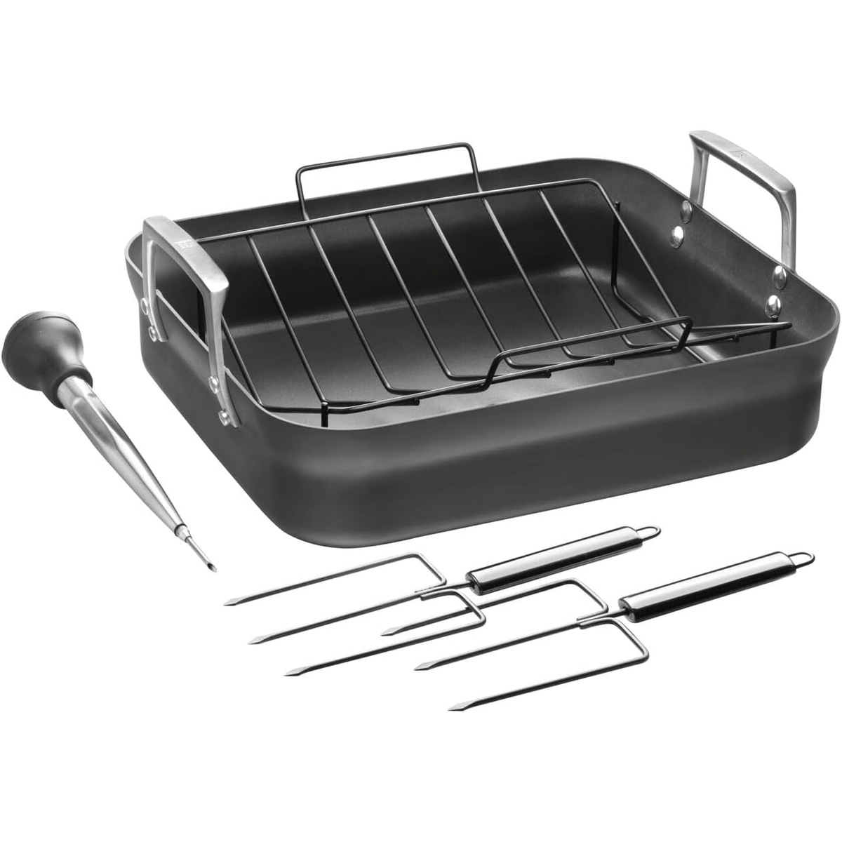 The Zwilling Motion Rectangular Grill Pan is designed for perfectly roasted meats and versatile oven-to-stovetop cooking. Featuring a removable rack, your roasts stay elevated above pan juices for crisp, browned exteriors and tender interiors. Included stainless steel turkey forks and a baster make handling and basting large cuts simple and convenient.